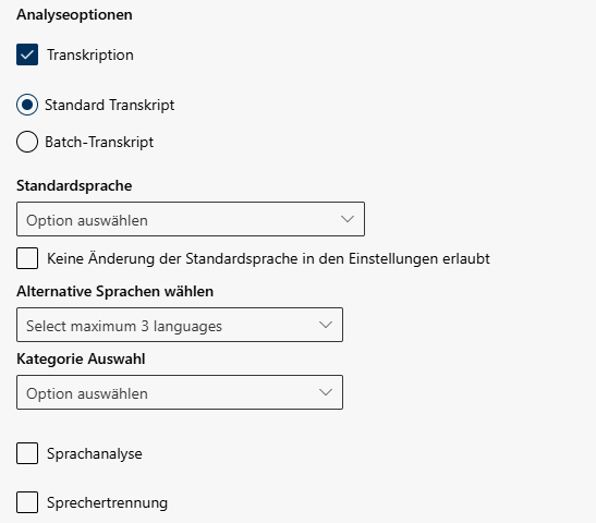 Analyseoptionen | In den Analyseoptionen legen Sie fest, ob und wie Aufzeichnungen transkribiert werden sollen. Sie können die Transkriptionsmethode auswählen, die Transkriptionssprache festlegen, die Übersetzung von Transkripten aktivieren, die Sprachanalyse und Sprechererkennung aktivieren und Kategorien anwenden, um relevante Schlüsselwörter zu identifizieren.