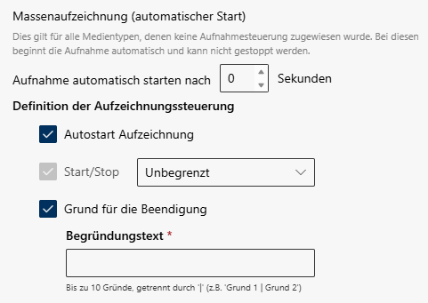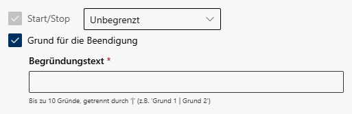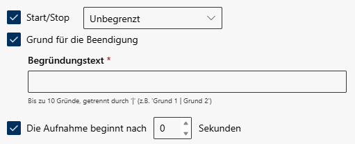 Grund für Beendigung Geben Sie einen Grund an, warum die Aufzeichnung gestoppt werden muss.