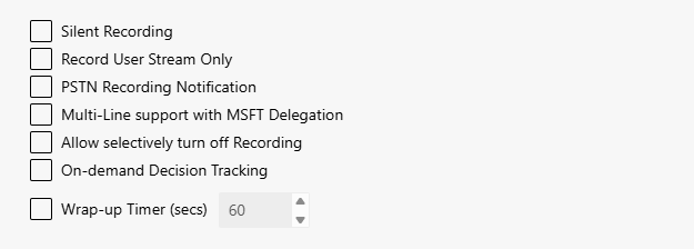 Wrap-up Timer (secs): Defines the post-processing time in seconds available to users to make notes or edits after the end of the call before the recording is completed.