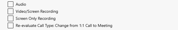 Audio: Activate to enable voice recording. Video/Screen Recording: Activate to record videos and split screen content. Screen Only Recording: Activate to record only the screen content of the call participants. Re-evaluate Call Type: Change from 1:1 Call to Meeting: Activate to re-evaluate and adjust the recording rule when changing the conversation type. Meetings may be subject to other policies.
