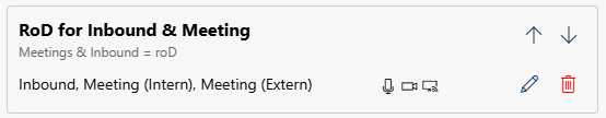 The field displays on top the name of the Profile Rule, below a description and which Conversation Types are concerned. The icons show following information: