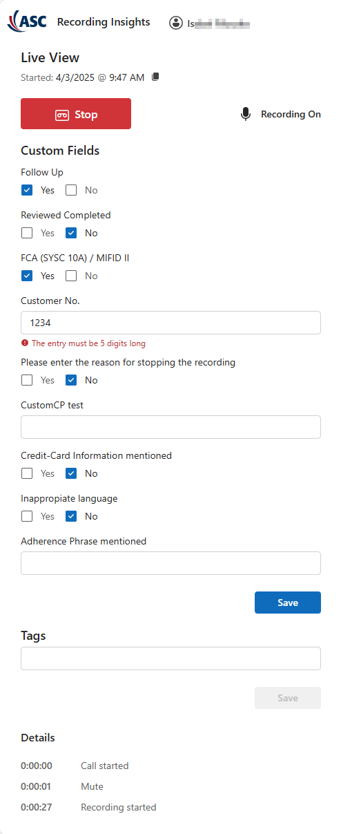 The view of the live conversation varies depending on the Recording Type. The Recording Type is defined in the recording rule.